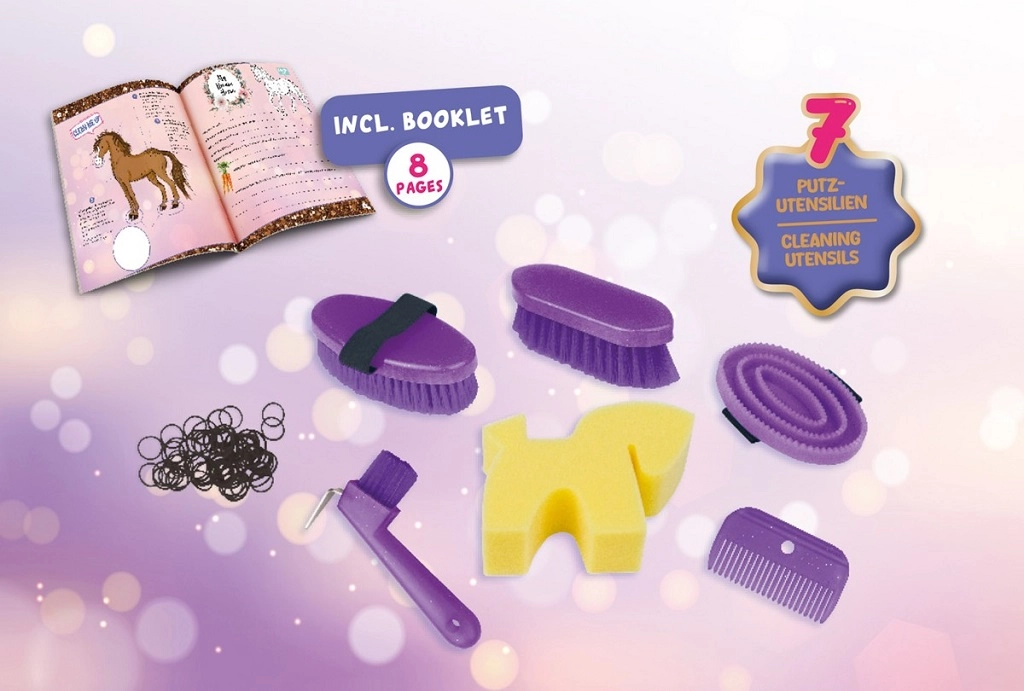 S touto kompletnou sadou deti zažijú radosť z naozajstnej starostlivosti o svojho koníka. Všetky pomôcky sú uložené v praktickom boxe s uchom, takže ich môžu mať kedykoľvek poruke doma aj v stajni. Vďaka ergonomickému dizajnu sa nástroje dobre držia a práca je pohodlná a bezpečná.
