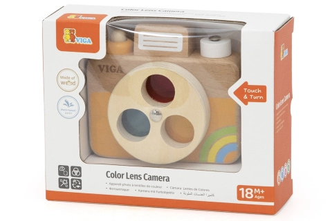 Doprajte deťom svet plný farieb a predstavivosti. Drevený fotoaparát s farebným objektívom umožňuje malým fotografom striedať tri farebné filtre – červený, žltý a modrý – a pozorovať okolie v novom svetle. Realistické ovládacie prvky, ako je tlačidlo spúšte, otočný horný gombík a zadné zrkadlo, prinášajú autentický a zábavný herný zážitok.