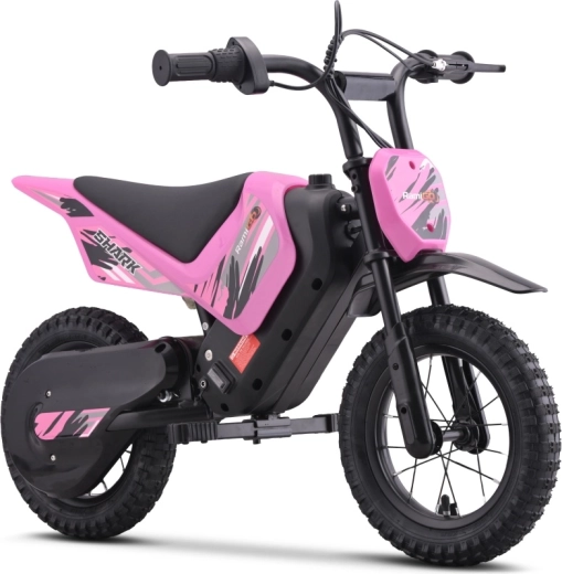 Štýlová detská elektrická motorka SHARK v ružovej farbe ponúka bezpečnú zábavu na dvore aj na spevnených cestách. Má pevný práškovo lakovaný rám, nafukovacie terénne pneumatiky s hlbokým dezénom a maximálnu rýchlosť až 15 km/h. Pohon zabezpečuje tichý 150W elektromotor s reťazovým prevodom, k dispozícii sú 2 rýchlostné režimy a praktický ukazovateľ stavu batérie.
