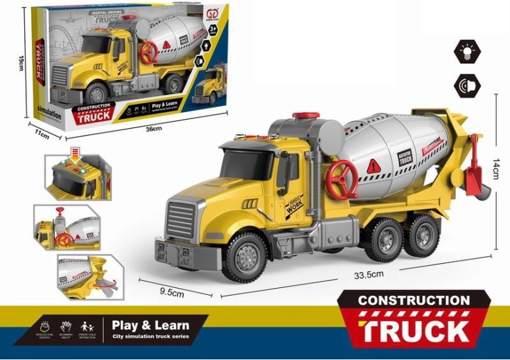 Táto žltá detská miešačka betónu verne napodobňuje skutočný stavebný stroj. Stačí ju postrčiť a vďaka treciemu pohonu sa sama rozbehne. Autentické zvuky miešania cementu a stavebného ruchu spolu so svetelnými efektmi vtiahnu deti do sveta stavby a podporia ich fantáziu.