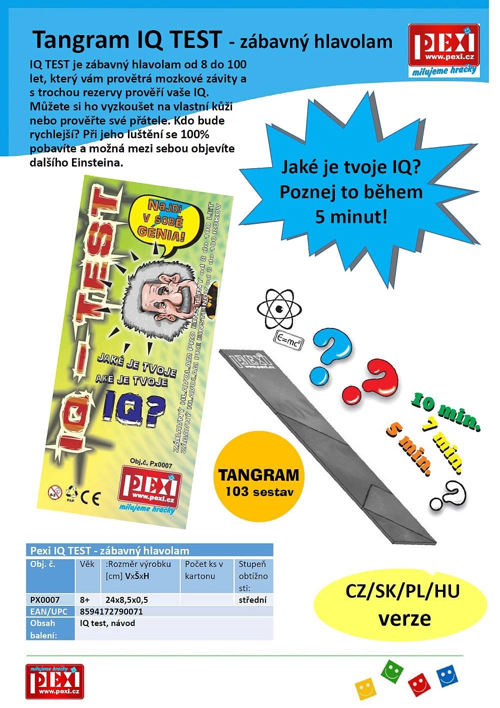 Hľadáte chytľavý darček alebo aktivitu na cesty? Tangram IQ test je kompaktný, ľahko pochopiteľný a zakaždým inak náročný. Perfektná voľba pre všetkých, ktorí milujú logické hry a hlavolamy.