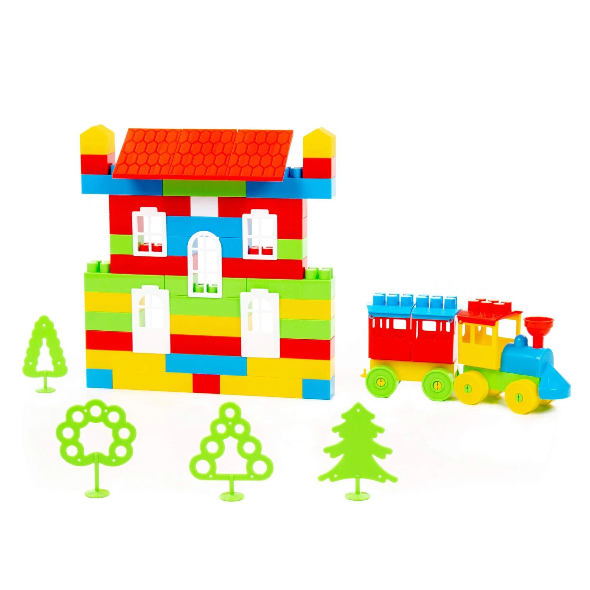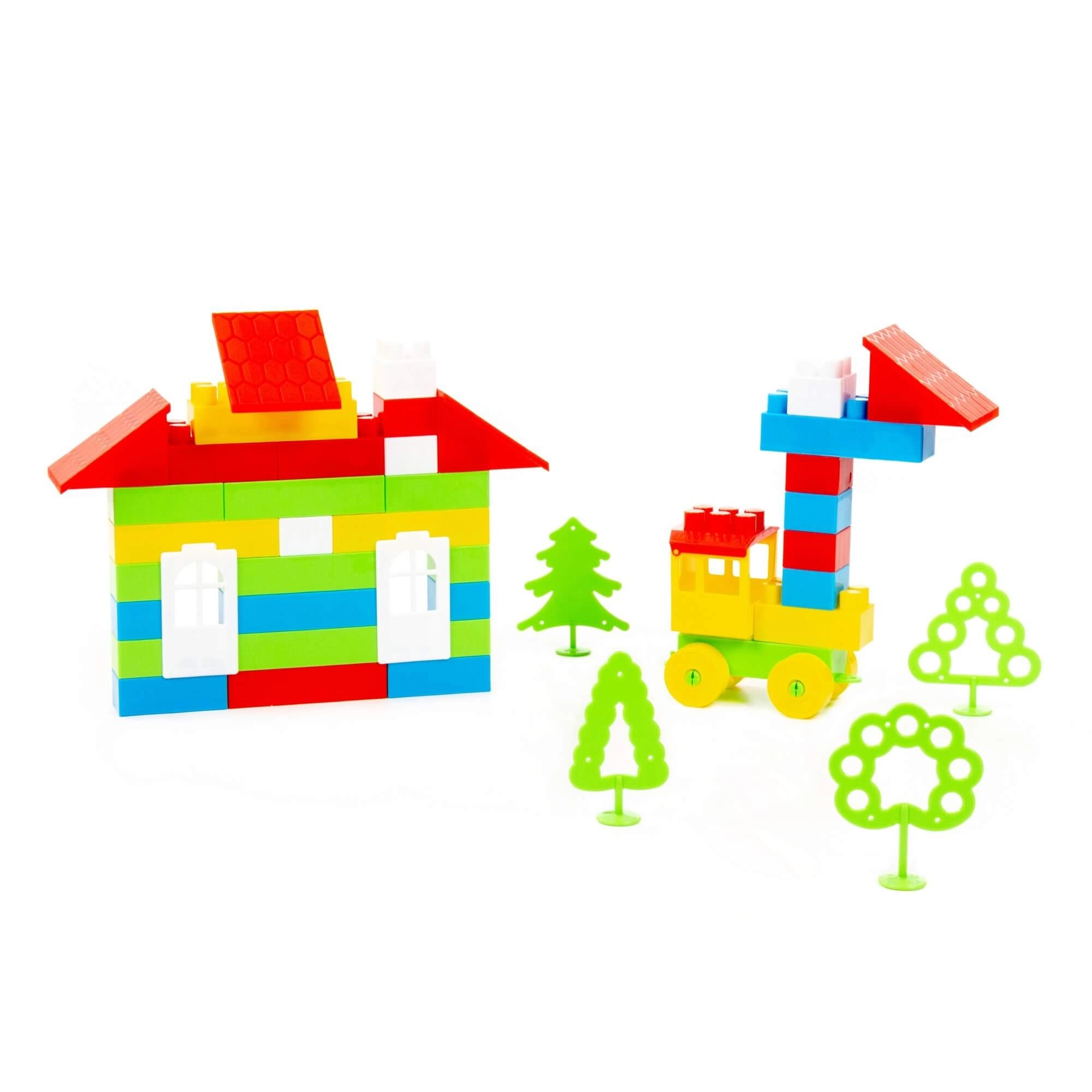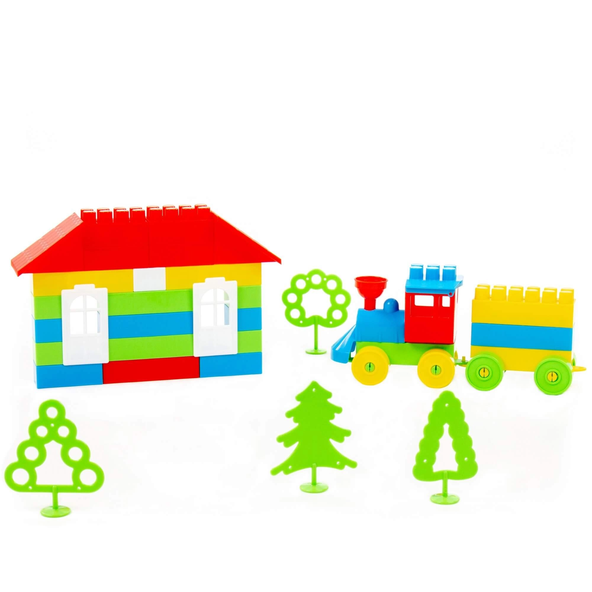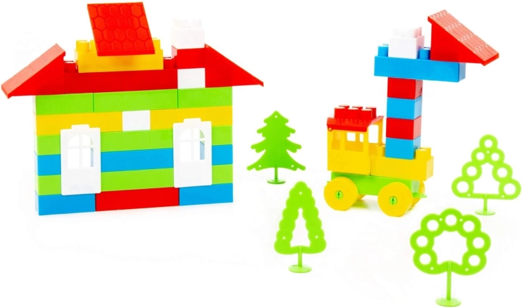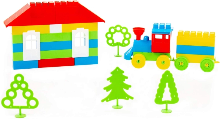 Postavte dvojposchodový domček so strechou, oknami a doplňte scénu vláčikom a stromami pre ešte zábavnejšiu hru.