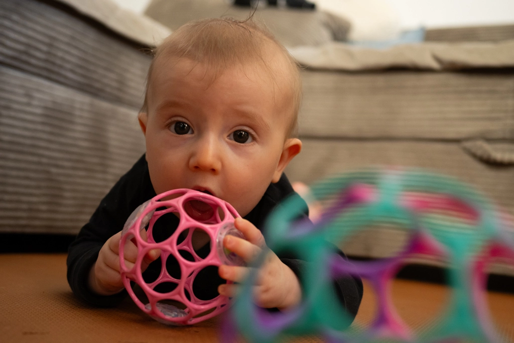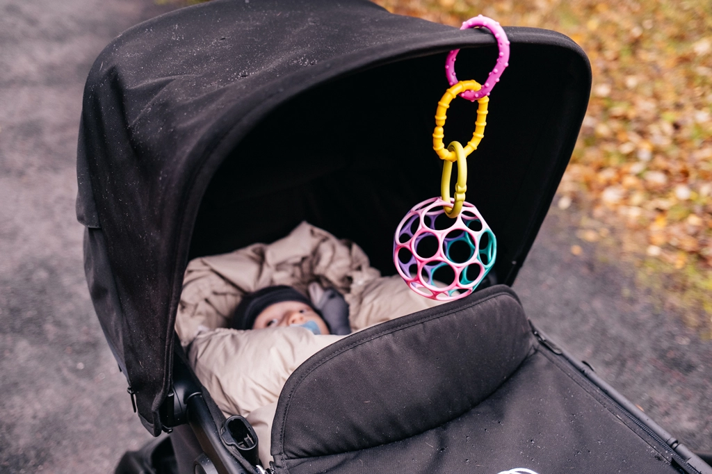 OBALL možno ľahko prichytiť k hrazdičke alebo kočíku a zabaví dieťa počas prechádzok, cvičenia na brušku aj hrania na podložke.