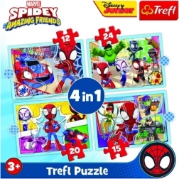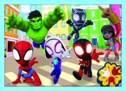 Objavte farebný svet superhrdinov so sadou puzzle 4 v 1 s motívmi Spideyho a jeho priateľov. Každé zo štyroch puzzle má iný počet dielikov, takže deti môžu postupne zvyšovať svoju zručnosť a sebavedomie. Po zložení vzniknú štyri obrázky s rozmermi 285 × 205 mm, ideálne pre detské ruky.