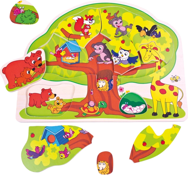 Vkladačka má tvar stromu a obsahuje 11 samostatných dielikov so zvieratkami a pevnú základňu. Vďaka odolnej preglejke je ideálna na každodenné používanie doma aj v škôlke.