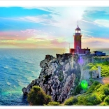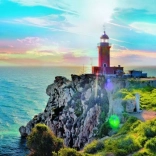 Motív majáku na útesu skvele ladí s morskou scenériou a vytvára úchvatný vizuálny zážitok.