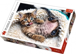 Tieto puzzle o 1000 kusoch zobrazujú veselé mačiatko. Po zložení vytvoria obrázok o rozmeroch 68x48 cm. Zaručujú vysokú kvalitu, jasné farby a bezpečnosť skladania pomocou kalandrovaného papiera odpudzujúceho svetlo a ekologických potravinárskych farieb.
