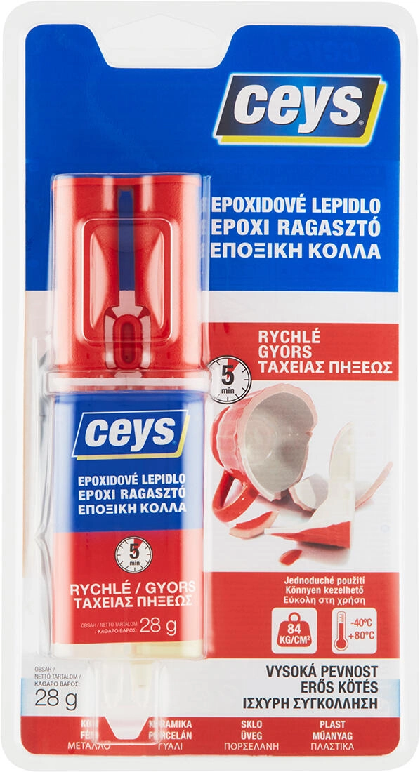Epoxidové lepidlo EPOXICEYS 5 minút je ideálnou voľbou na rýchle a spoľahlivé opravy doma, v dielni aj v priemysle. Dvojzložková receptúra vytvára silný, trvanlivý a presný spoj s krátkou dobou vytvrdzovania. Praktická striekačka uľahčuje čisté a presné dávkovanie, takže vždy dosiahnete optimálny pomer miešania.
