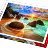 Puzzle prináša malebný výhľad na pláž s dramatickým západom slnka, oceánskymi vlnami a skalami.