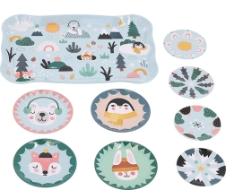V balení nájdete všetko na dokonalé čajové dýchánky: veľký podnos na jednoduché servírovanie, 4 hrnčeky s podšálkami, 4 dezertné tanieriky a konvičku s viečkom. Diely sú ľahké, odolné a ľahko sa udržiavajú. Dizajn od Michelle Carlslund s priateľskými zvieratkami podnecuje detskú predstavivosť a jemne rozvíja sociálne zručnosti pri spoločnej hre.