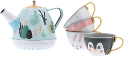 Táto kvalitná kovová čajová súprava poteší všetkých malých hostiteľov a hostiteľky. Vo vnútri konvičky je skrytý naťahovací hudobný strojček, ktorý sa pri naklonení rozoznie príjemnou melódiou a premení každé podávanie čaju na malý ceremoniál. Pastelové farby, milé zvieracie motívy a čisté tvary robia zo súpravy krásny darček aj štýlový doplnok detskej izby.