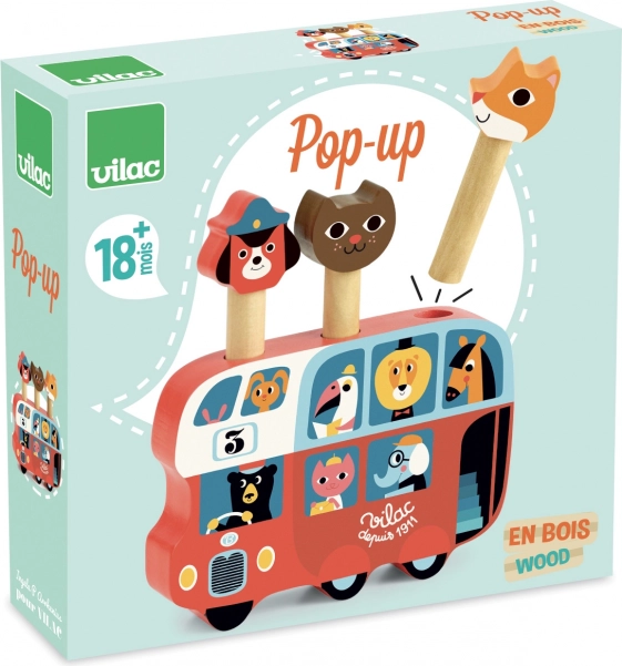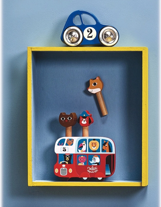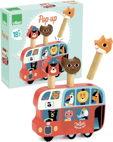 Vilac Drevená vystreľovacia hra Autobus so zvieratkami je krásna hračka s ilustráciami od známej umelkyne Ingely P. Arrhenius. Tri rozkošné postavičky – líška, psík a mačička – vystreľujú z autobusu, čo deti zaručene pobaví.