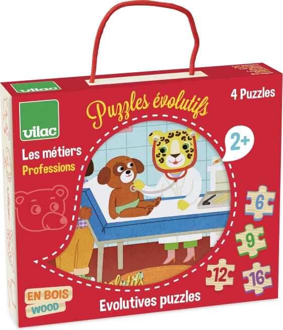 Táto sada obsahuje štyri vývojové puzzle s motívmi rôznych povolaní, navrhnuté tak, aby deti motivovala k postupnému zlepšovaniu. Vďaka rozdielnemu počtu dielikov si malé rúčky osvoja správne techniky skladania a naučia sa rozpoznávať tvary aj farby.