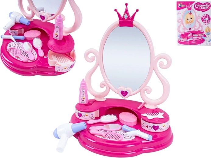 Súčasťou balenia je 9 praktických doplnkov: hrebeň, kefa, zrkadlo, pinzeta, sponka-hrebeň, kulma, púderník, fén a tuba s krémom. Stolík má dve malé zásuvky na uloženie drobností a je vyrobený z odolného a bezpečného plastu bez zápachu, ktorý zaistí dlhú životnosť aj pohodlné používanie.