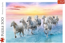 Puzzle obsahujúce 500 dielikov, ktoré zobrazujú krásu a eleganciu bielych koní v plnom behu. Zložením tohto puzzle získate obraz s rozmermi 48x34 cm.