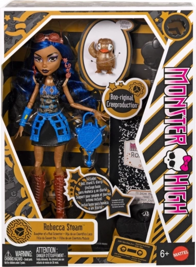 Obľúbená hrdinka MONSTER HIGH sa vracia v reedícii Creeproduction, ktorá ctí pôvodnú prvú generáciu. Robecca zaujme bronzovým tónom pleti, výrazným líčením a modro‑čiernymi vlasmi. Jej outfit s motívmi ozubených koliesok, kovovo ladenou sukňou, vysokými „raketovými“ topánkami a medenými okuliarmi je esenciou steampunkového štýlu.