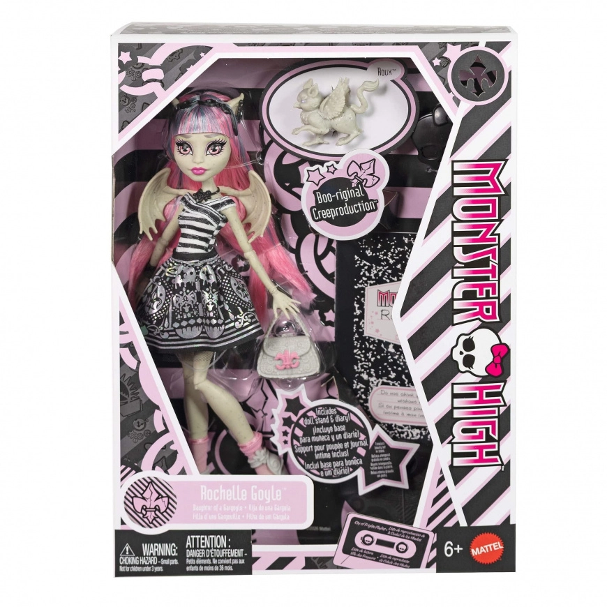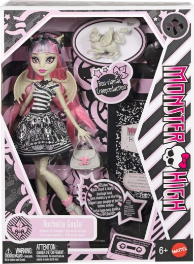 Vráťte sa do sveta Monster High s návratom kultovej postavy Rochelle Goyle. Bábika vyniká čiernobielym pruhovaným topom, metalickou minisukňou a ružovými akcentmi, ktoré ladia s jej dlhými ružovými vlasmi. Detailné líčenie, doplnky a ikonické krídla dotvárajú jedinečný „scarisovský“ štýl.