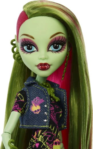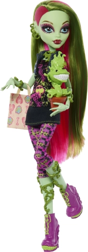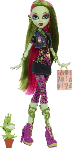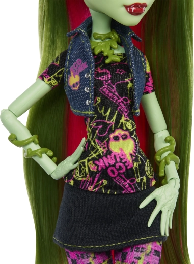 Venus McFlytrap očarí výraznými botanickými vzormi, ružovo‑zelenými vlasmi a detailnou bižutériou. Pružná konštrukcia s 11 bodmi artikulácie umožňuje realistické pózy a kreatívne rozprávanie príbehov zo sveta MONSTER HIGH. V balení nájdete aj verného miláčika Chewliana, ktorý dodáva setu zberateľskú hodnotu.