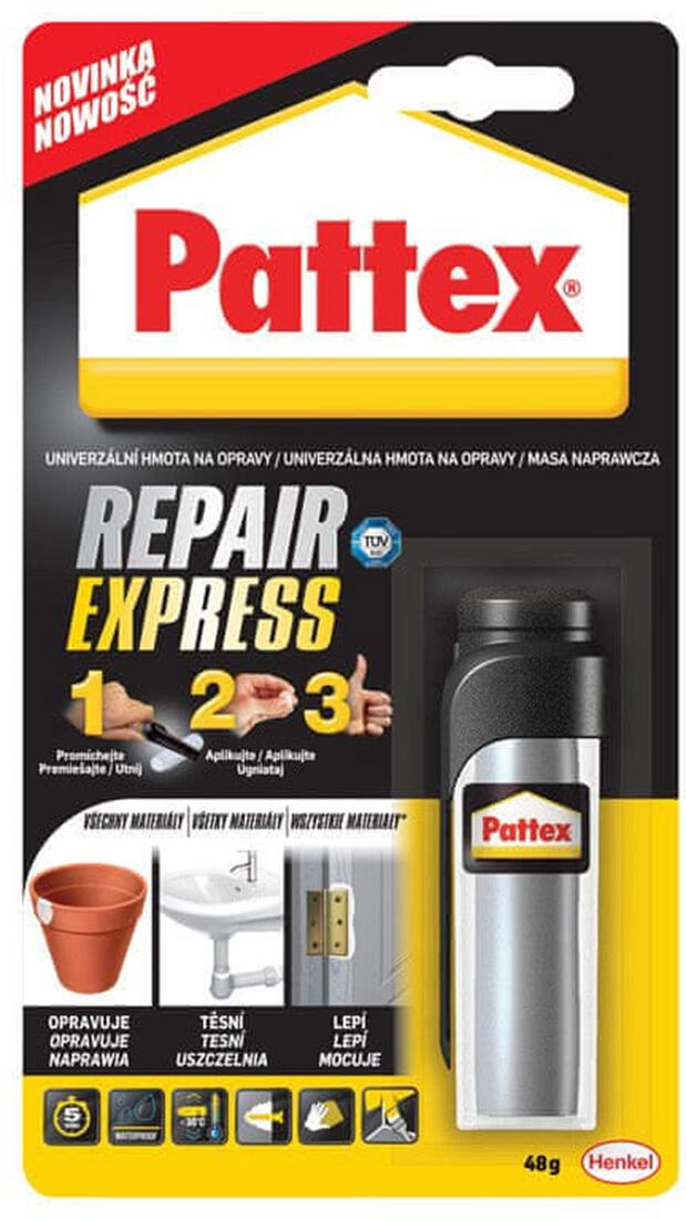 Univerzálna epoxidová opravná hmota PATTEX Repair Express je ideálna na rýchle a trvácne opravy v domácnosti. Vhodná na lepenie a rekonštruovanie kúpeľňového a kuchynského príslušenstva, ako sú držiaky na uteráky, úchytky, vešiaky, mydelničky či držiaky na mixéry. Ľahko sa tvaruje, rýchlo tvrdne a po vytvrdnutí je pevná a odolná.