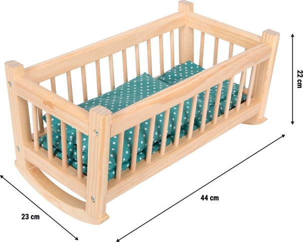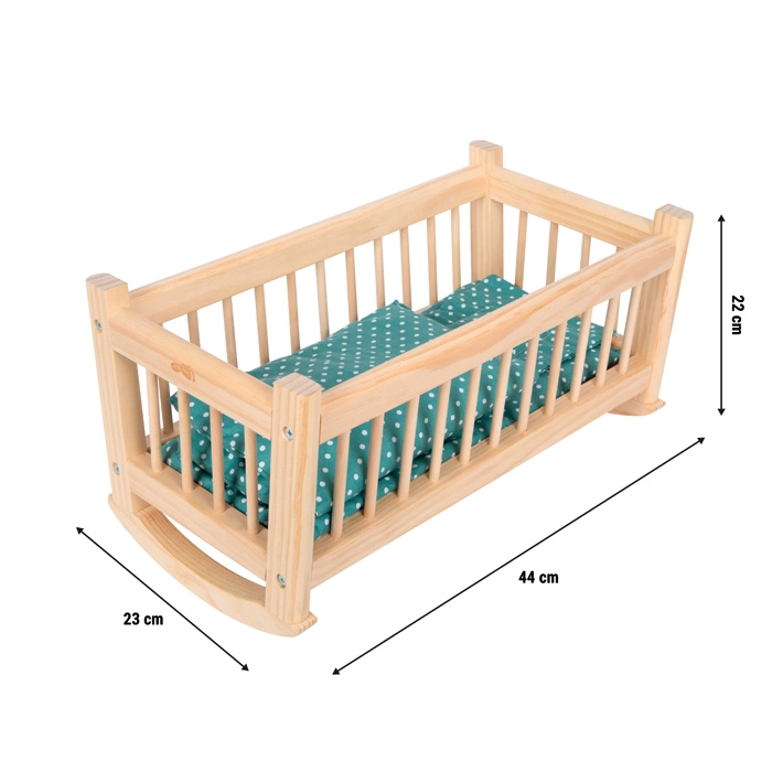 Táto prírodná drevená kolíska je ideálnym doplnkom detskej izby aj domčeka pre bábiky. Stabilný kolískový rám zabezpečuje plynulé hojdanie, ktoré upokojuje bábiky a plyšových kamarátov až do veľkosti 39 cm. Súčasťou je zladená textilná výbava v jemnom dizajne pre maximálne pohodlie.
