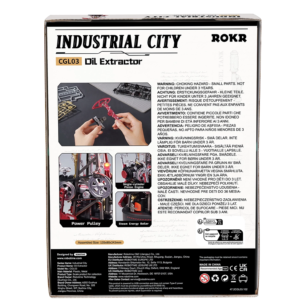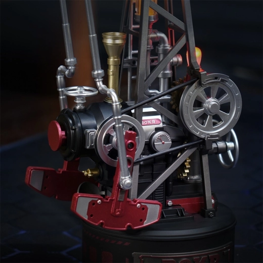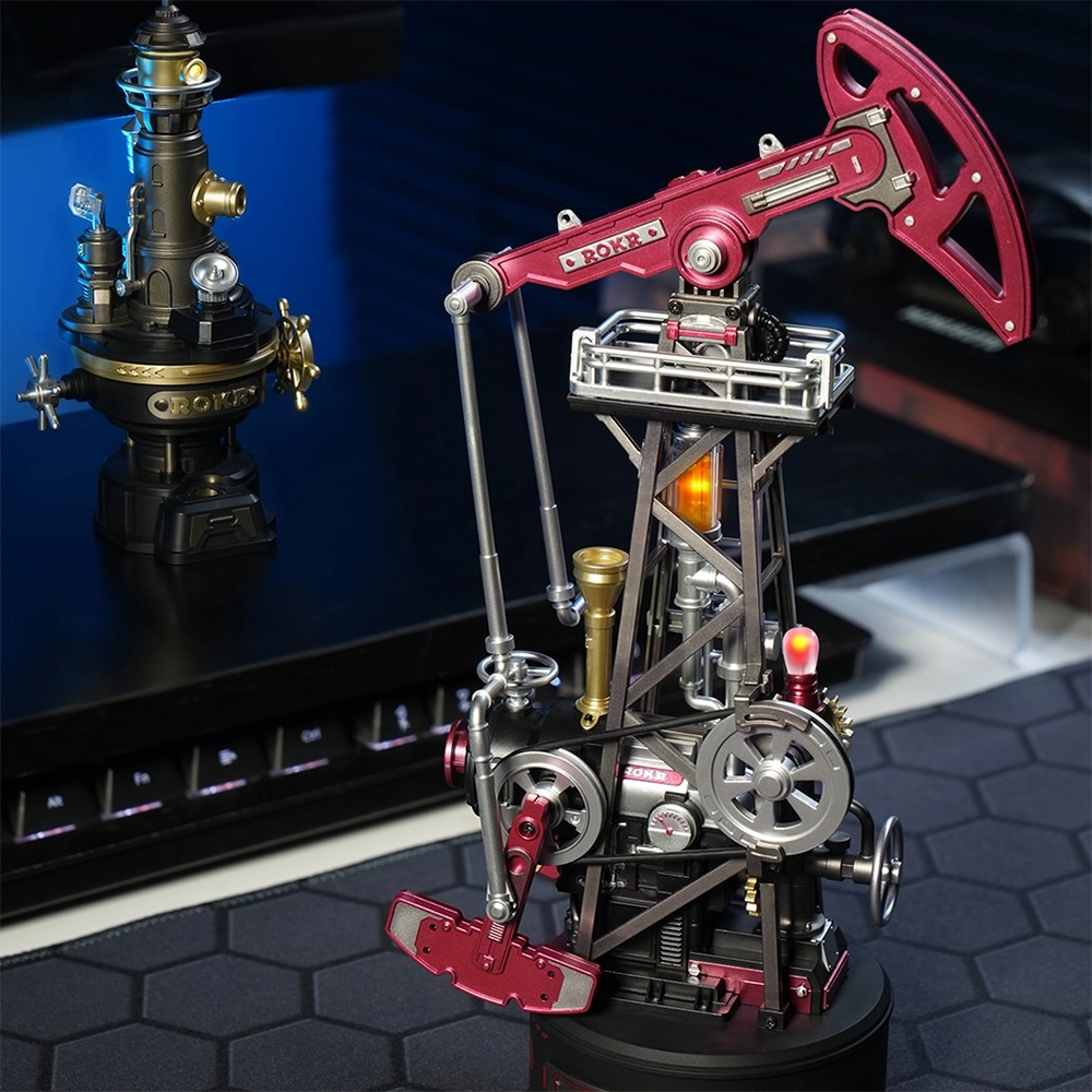 Táto mechanická skladačka inšpirovaná historickým ťažobným strojom pumpjack prináša techniku priamo na váš stôl. Prepracovaný systém ozubených kolies, kľukový mechanizmus, protiváha a piest zabezpečujú plynulý a autentický chod. LED efekt v „parnom kotle“ elegantne simuluje horenie a podčiarkuje industriálnu atmosféru.