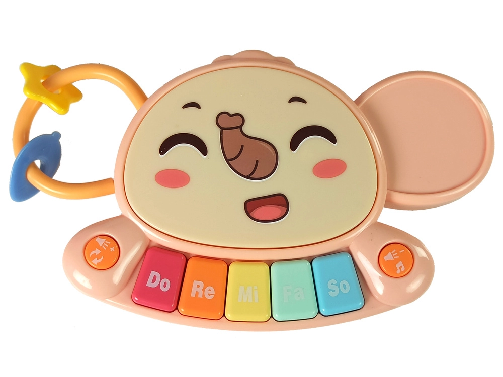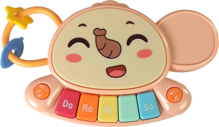 farebné piano (Do–Re–Mi–Fa–So), 3 ozubené kolieska, geometrické tvary na šnúrkach, košík a loptičky, otočné kocky