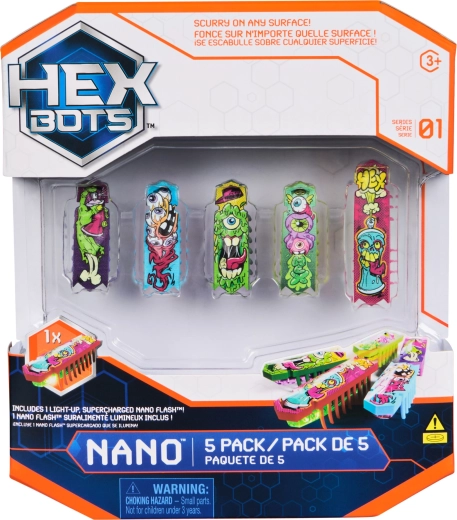 HEXBOTS Nano prinášajú do detskej izby modernú technológiu vo vreckovom prevedení. Vďaka vibračnému pohonu sa chrobáčiky realisticky trasú a svištia po rovných plochách, odrážajú sa od prekážok a v prípade pádu na chrbát sa vedia samy otočiť. Špeciálny Flash Nano je väčší, rýchlejší a zaujme LED osvetlením, ktoré dodá hrám ešte viac akcie.