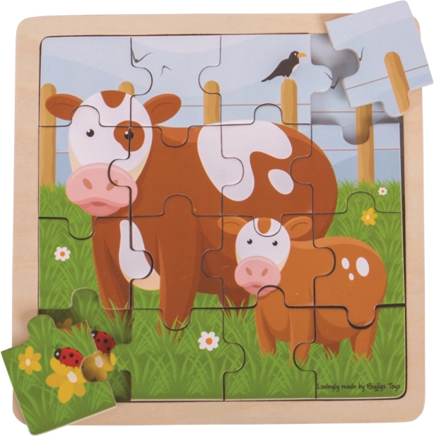 Roztomilé drevené puzzle kravička s teliatkom od Bigjigs Toys poteší deti od 2 rokov. Obsahuje 16 dielikov s podkladovou doskou a rámom pre jednoduché skladanie. Dieliky sú prispôsobené na jednoduché uchopenie a hračka rozvíja motoriku, slovnú zásobu, fantáziu aj sústredenie. Vyrobené zo zodpovedne získaného dreva v súlade s európskymi normami.