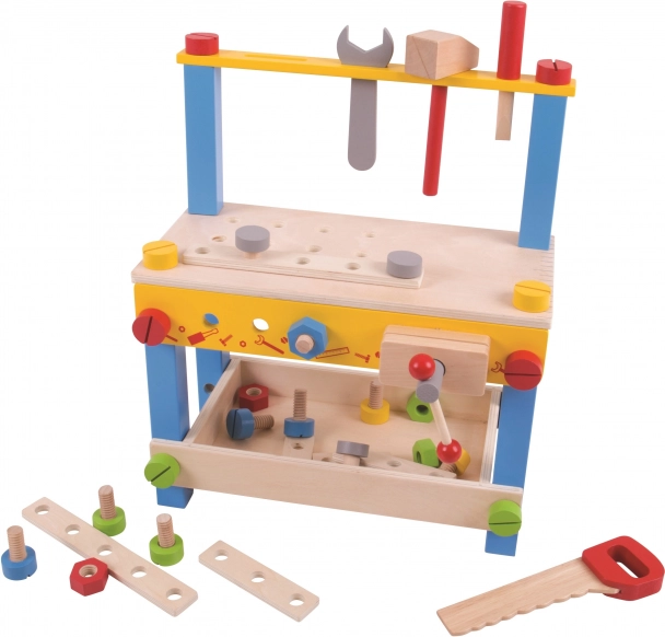 Súčasťou je zverák, kľúč, skrutkovač, kladivo, pílka, skrutky a matice, ktoré možno opakovane zostavovať a rozoberať. Stabilná konštrukcia a šikovné úložné prvky udržia všetko prehľadne po ruke. Set je ideálny na samostatnú aj spoločnú hru a podporuje trpezlivosť a sústredenie.