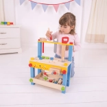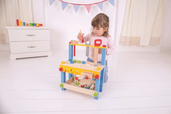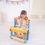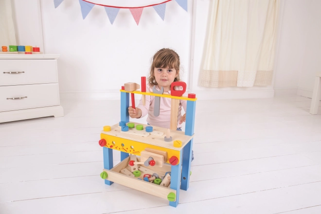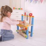 Tento farebný drevený pracovný stôl BIGJIGS TOYS je skvelým štartom do sveta náradia. Vďaka reálnym prvkom a bezpečným dreveným nástrojom si deti precvičia praktické zručnosti a naučia sa základné princípy práce s náradím – hravou a bezpečnou formou.