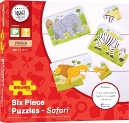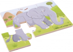 Sada obsahuje 3 skladačky s motívmi leva, zebry a slona – ideálne na postupné učenie aj pestrejšiu hru.