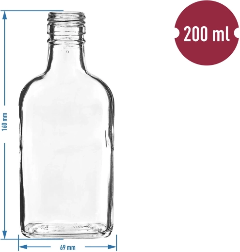 Táto číra sklenená ploskačka kombinuje tradičný tvar s praktickými detailmi na každodenné použitie. Je skvelá na domáce destiláty, likéry, ochutené oleje aj sirupy a vďaka kompaktnej veľkosti ju ľahko vezmete na výlety, pikniky alebo ako štýlový darček.