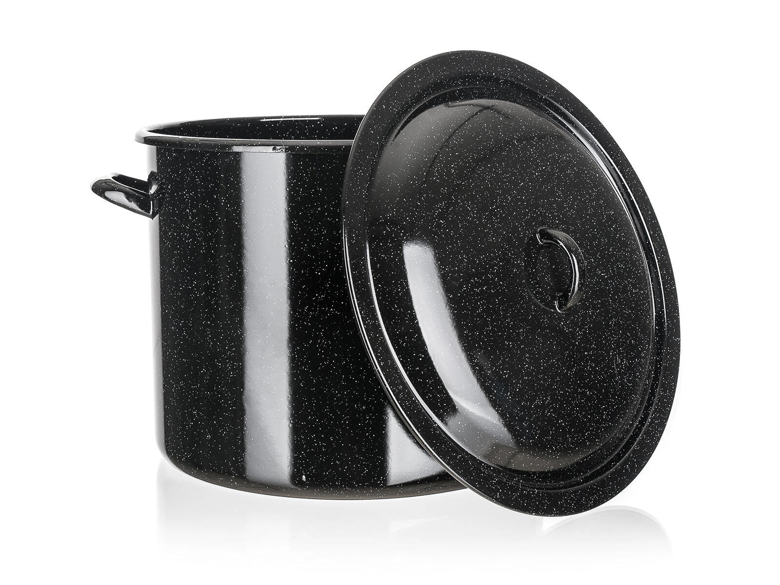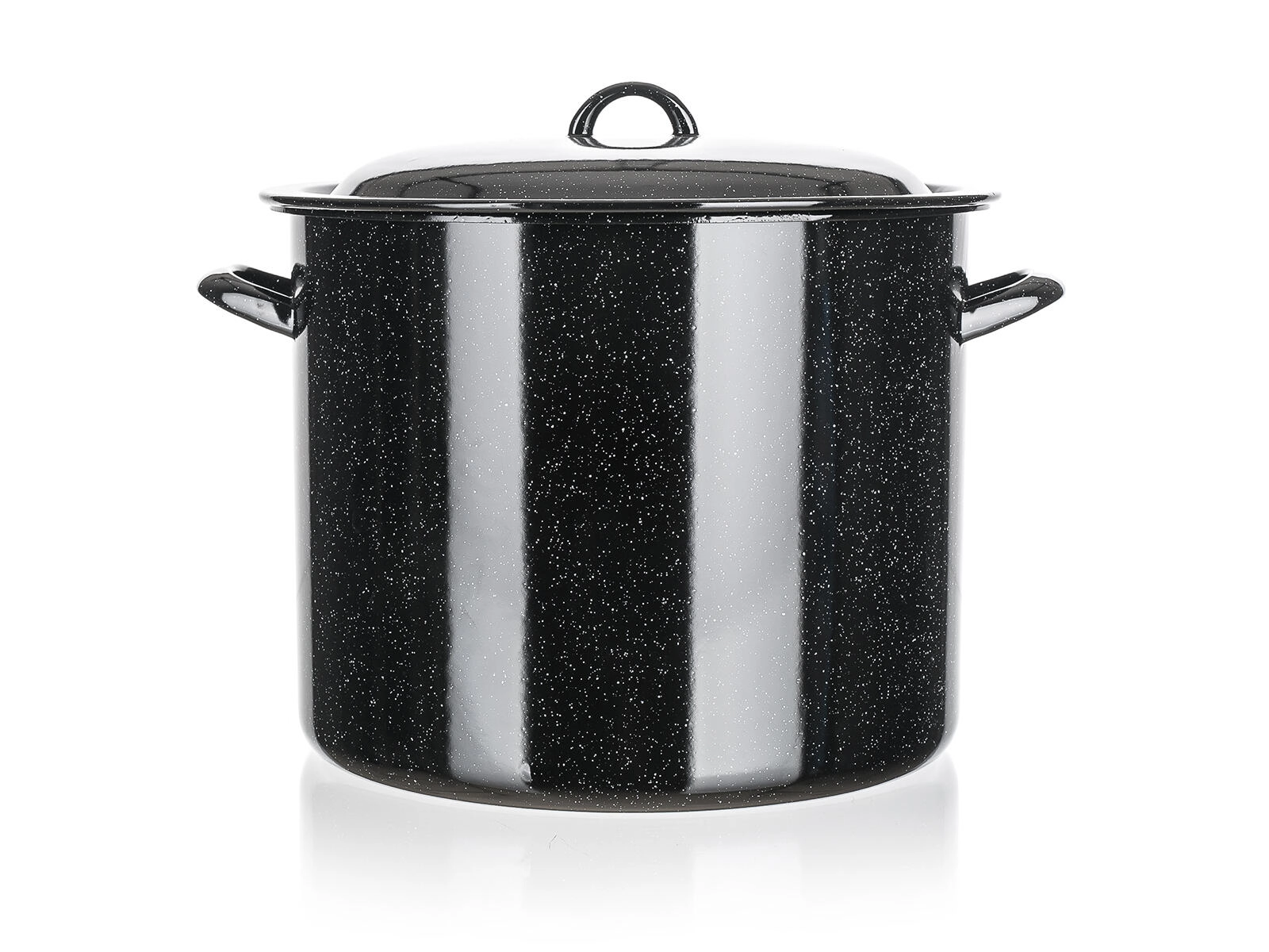 Objemný smaltovaný hrniec s pokrievkou s objemom 17 l a priemerom 30 cm je ideálny na varenie polievok, vývarov, cestovín či sterilizáciu. Odolný smaltovaný povrch sa ľahko čistí a rovnomerne rozvádza teplo. Vhodný pre všetky typy varných dosiek okrem indukcie.
