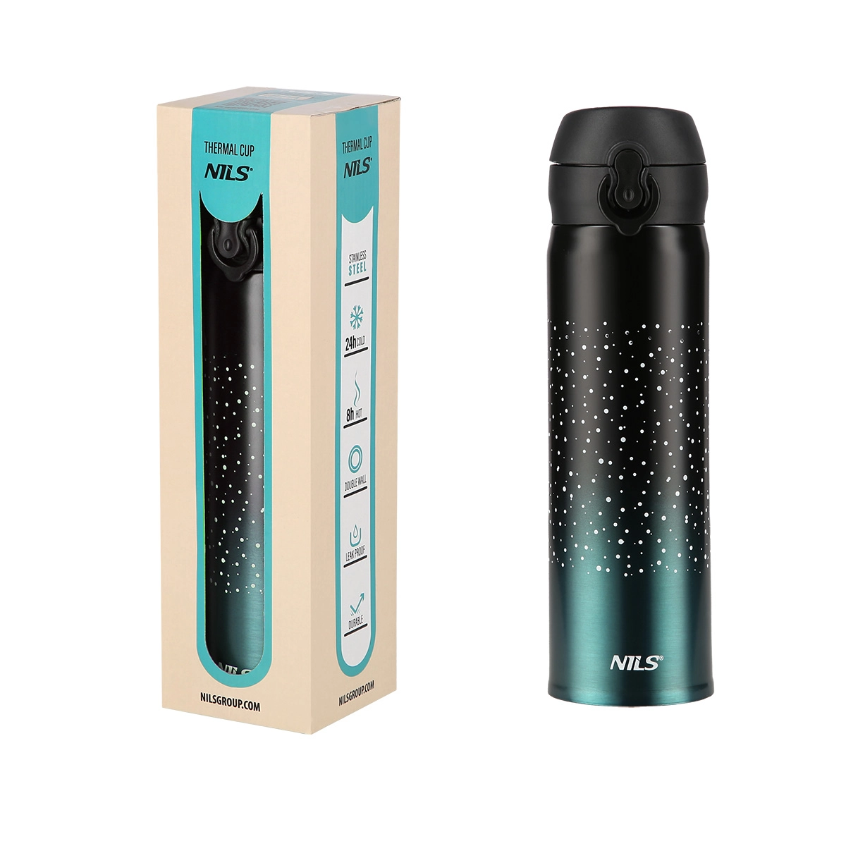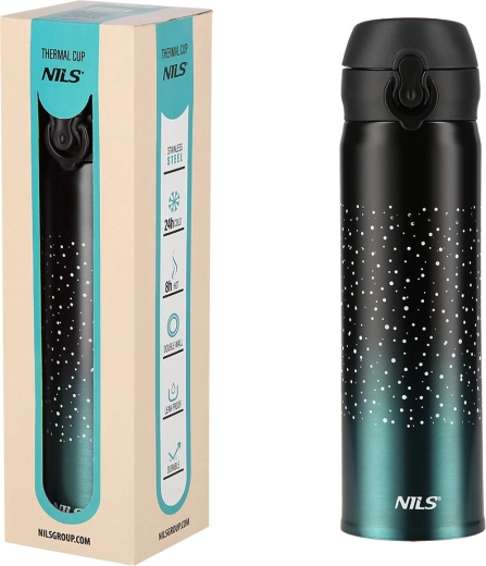 Štýlová termoska NILS Camp s objemom 500 ml udrží nápoje teplé až 12 hodín a studené až 24 hodín. Má dvojitú nerezovú stenu, bezpečné uzamykateľné viečko s tlačidlom na rýchle otvorenie a tesniaci silikón proti pretekaniu. Ideálna do auta, kancelárie aj na výlety – štíhle telo skvele sadne do väčšiny držiakov na nápoje.