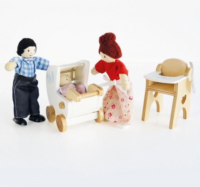 Roztomilá drevená sada na nápaditú hru s bábätkom od značky LE TOY VAN. Obsahuje kočík, vysokú jedálenskú stoličku, jedálenskú súpravu a tašku. Textilné doplnky sú ručne šité a všetky diely sú vyrobené z kvalitného kaučukového dreva. Hračka je zdobená netoxickými farbami na vodnej báze, je eticky vyrobená a podporuje kreativitu, jemnú motoriku aj koordináciu.