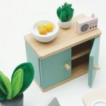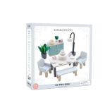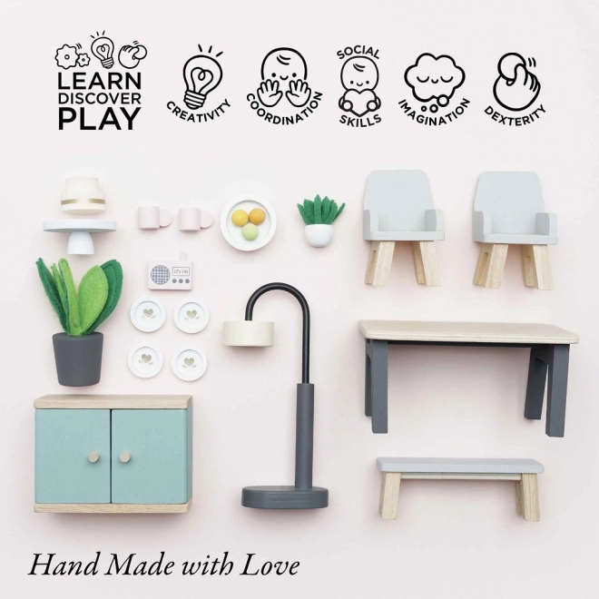 Tento pôvabný jedálenský set je vyrobený z kvalitného FSC certifikovaného dreva a prináša do každého domčeka pre bábiky dotyk sofistikovanosti. Obsahuje 18 prvkov, vrátane stola, dvoch kresiel, lavice, lampy, príborníka a dekoratívnych doplnkov ako sú rastliny, miska s ovocím a torta. Tento set nielenže vyzerá krásne, ale tiež podporuje poznávacie a komunikačné schopnosti detí. Je dekorovaný pomocou netoxických farieb na vodnej báze a je kompatibilný s ďalšími domčekmi Le Toy Van Dolls.