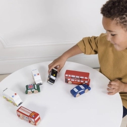 Sedem ikonických vozidiel z Londýna v jednej sade pre deti od 2 rokov. Odolné drevené autíčka z FSC® dreva sú ručne domalované vodou riediteľnými farbami, inšpirujú k tvorivej hre a rozvíjajú jemnú motoriku. Sada je kompatibilná s vláčikodráhami a drevenými garážami Le Toy Van aj iných značiek.