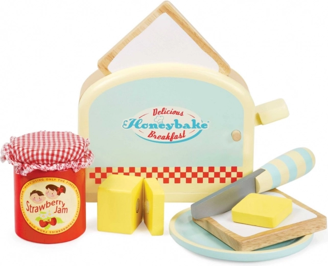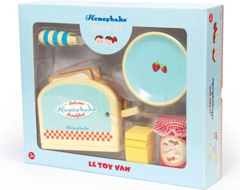 Drevená súprava Honeybake od LE TOY VAN premení detský kútik na útulnú kuchynku. Deti si zamilujú realistický hriankovač s pružinou, z ktorého po stlačení vyskočia dva krajce „hrianok“. Maslo so suchým zipsom učí správnemu úchopu a práci s nožíkom, zatiaľ čo pohárik jahodového džemu a tanierik doplnia každé hravé raňajky.