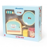 Súčasťou je drevený nôž, tanier, pohárik jahodového džemu, maslo na suchý zips a krajce chleba – všetko v jemných pastelových farbách.