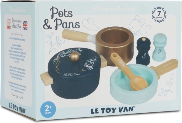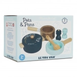 Hrniec s pokrievkou, rajnica, panvička a drevené doplnky podporujú nápaditú hru a imitáciu skutočného varenia.