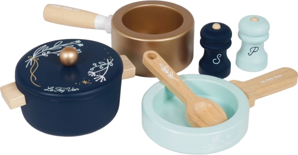 Štýlová drevená sada riadu pre malých kuchárov od 2 rokov. Obsahuje hrniec s pokrievkou, rajnica, panvička, vareška, soľnička a korenička. Vyrobené z FSC dreva, ručne maľované netoxickými farbami na vodnej báze a navrhnuté tak, aby podporovalo predstavivosť a jemnú motoriku pri bezpečnej hre.