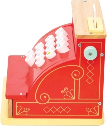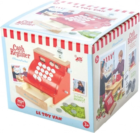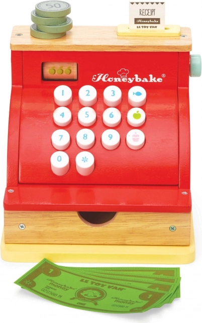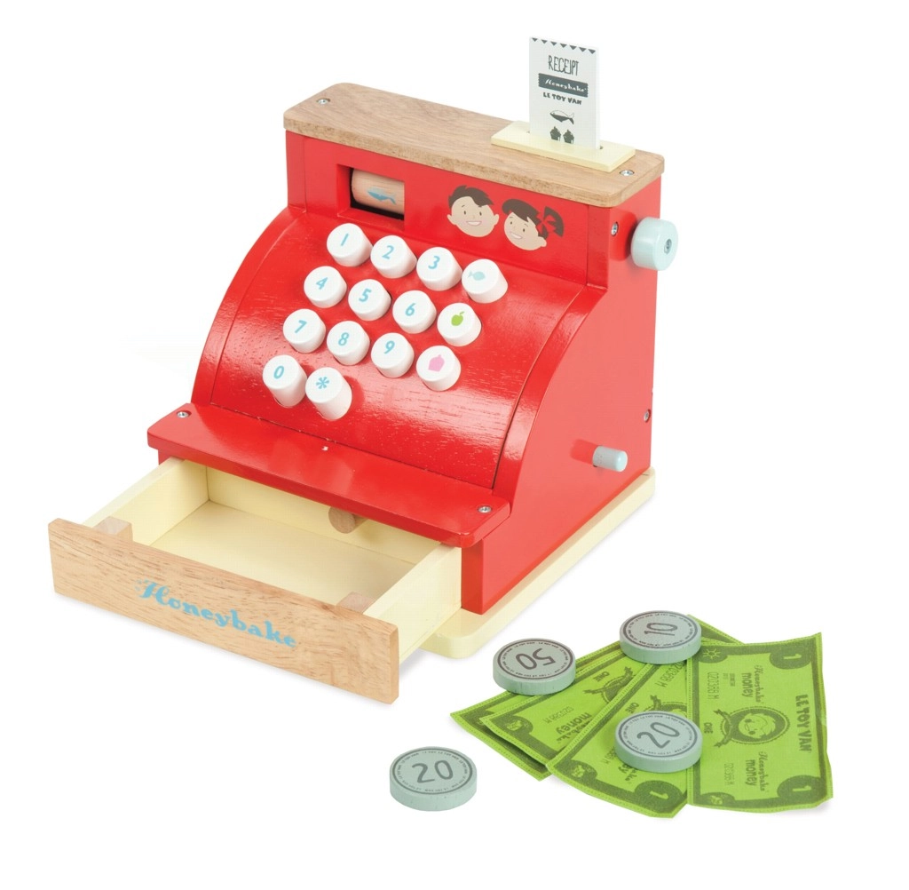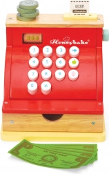 Červená drevená pokladňa LE TOY VAN z oceňovanej kolekcie Honeybake kombinuje kvalitné spracovanie, bezpečné materiály a očarujúci vintage vzhľad so zlatými detailmi. Je ideálna na hru na obchod a rozvoj sociálnych zručností, kreativity a základných matematických schopností.