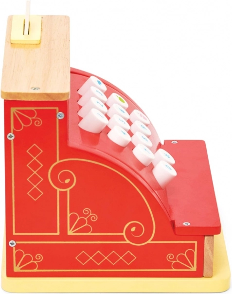 Veselá červená farba so zlatými prvkami a veľké tlačidlá robia z pokladne atraktívny kúsok do každého detského obchodíka.