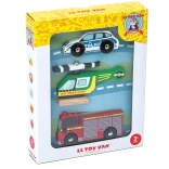 Drevené záchranárske autá od Le Toy Van prinášajú deťom možnosť kreatívnej hry. Obsahuje tri stroje - helikoptéru, policajné a hasičské auto, vyrobené z odolného kaučukového dreva s netoxickými farbami na báze vody. Ideálny darček pre mladých hasičov, pilotov a policajtov.