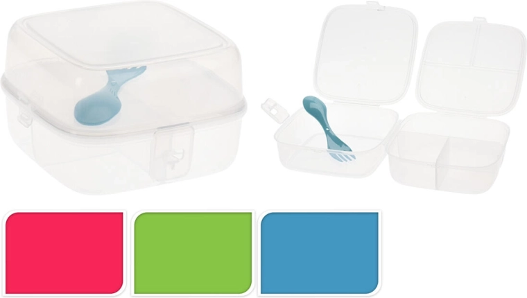 Súčasťou je praktický kombinovaný príbor (vidlička-lyžička), ktorý máte vždy po ruke. Kvalitný plast je ľahký, odolný a ľahko sa čistí. Skvelé riešenie na každodenné použitie doma, v kancelárii aj na cestách.