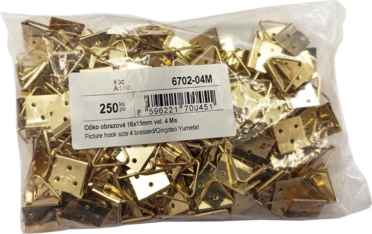 Praktické obrazové očko na spoľahlivé zavesenie rámov a fotografií. Rozmer 16 × 15 mm, veľkosť 4, v prevedení z mosadze pre dlhú životnosť a elegantný vzhľad. Balenie 250 ks je ideálne pre dielne, rámárov aj domáce použitie. Jednoduchá montáž pribíjaním na zadnú stranu dreveného rámu.