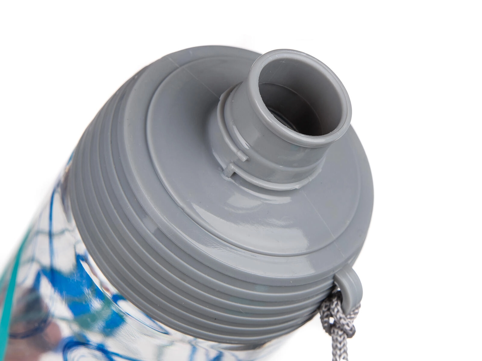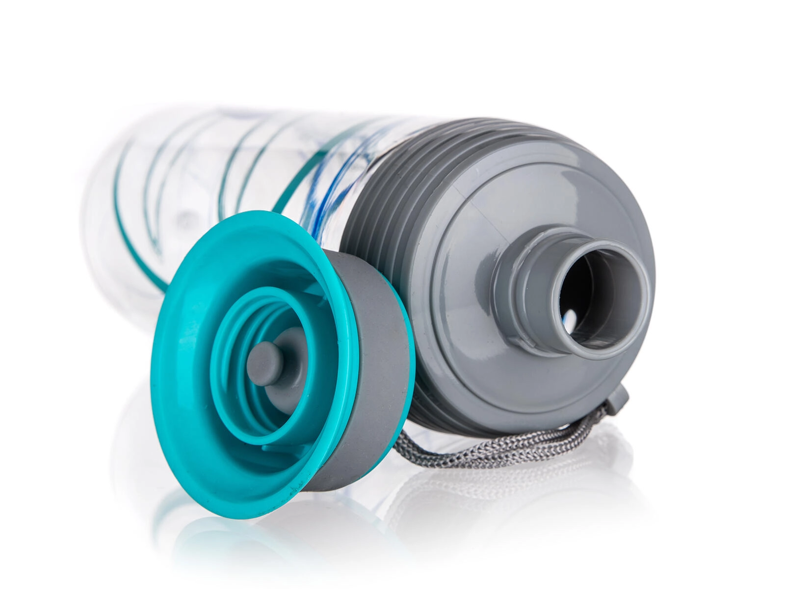 - Transparentné telo, tyrkysové/teal akcenty, modrá potlač