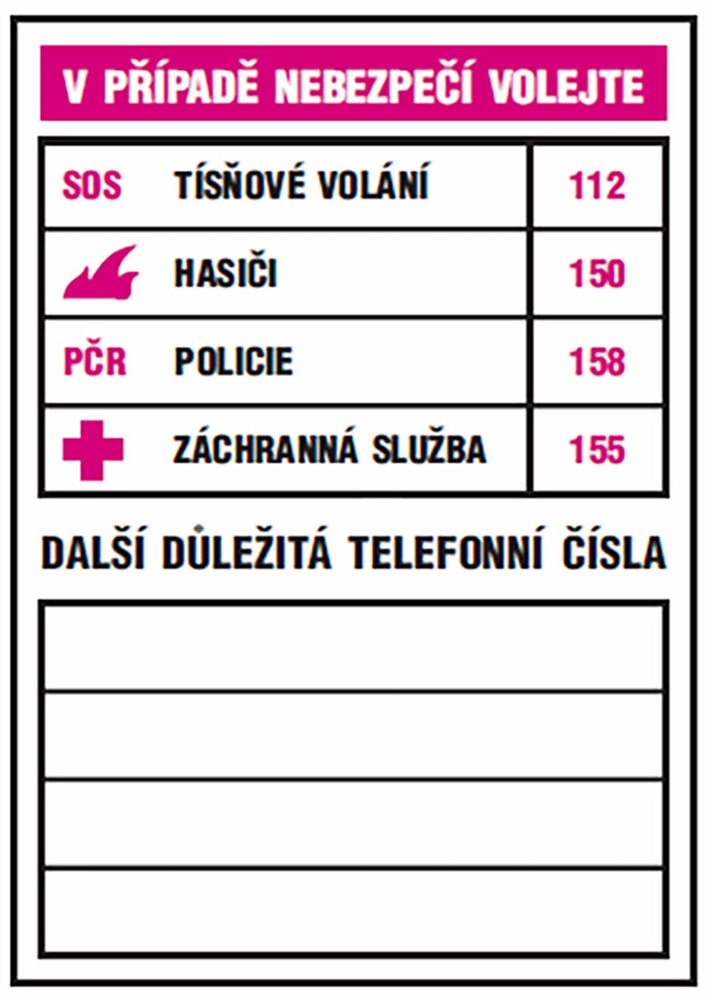 Uľahčite si krízové situácie s prehľadnou tabuľkou, ktorá ponúka priestor pre najdôležitejšie kontakty – integrované záchranné zložky, lekársku pohotovosť, poruchové linky či osobné kontakty. Vďaka kompaktným rozmerom 74 × 105 mm ju umiestnite tam, kde ju budete mať vždy na očiach.