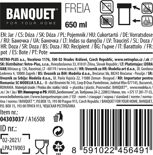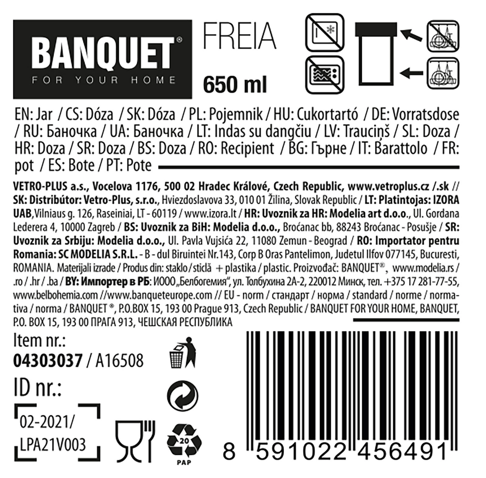 Štýlová a funkčná sklenená dóza FREIA s objemom 0,65 l je skvelá na každodenné skladovanie. Transparentné sklo umožňuje rýchlu orientáciu bez otvárania a nerezové viečko pomáha uchovať čerstvosť aj vôňu uložených surovín.