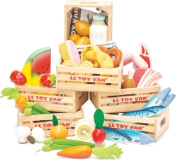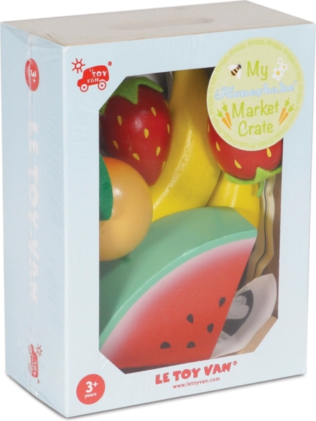Drevená bednička s ovocím od Le Toy Van je perfektným prostriedkom k rozvoju detskej imaginácie. Obsahuje rôzne druhy ovocia ako banán, jahodu a pomaranč. Všetky diely sú vyrobené z pevného a udržateľného dreva, maľované netoxickými farbami a majú ideálnu veľkosť pre malé detské ruky.